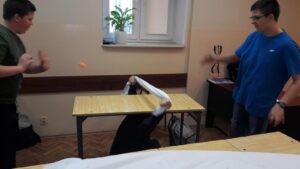 Hmmm… sporo jest zabawnych sytuacji. Najbardziej zaskakuje mnie kreatywność i twórczość uczniów. Przychodzi mi do głowy taki obraz sprzed dwóch miesięcy: uczniowie mając jedna piłeczkę do tenisa stołowego i kawałek prześcieradła zorganizowali mecz tenisa stołowego. Najlepiej będzie, gdy pokażę zdjęcie, bo to trzeba zobaczyć.